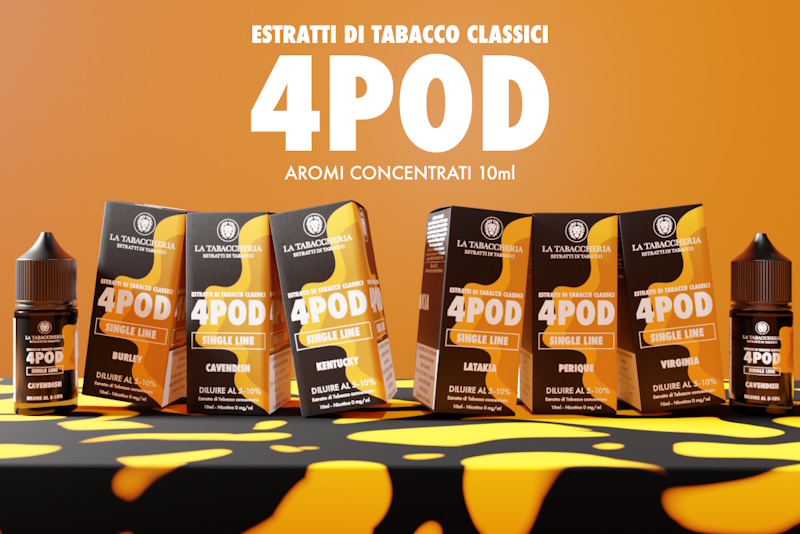 Disponibili da Svaporotondo a Monterotondo (Roma) tutti gli Aromi Concentrati 4POD di La Tabaccheria. I prodotti della Linea 4POD sono caratterizzati dall’uso di componenti aromatiche organiche estratte da foglie di vero tabacco processate tramite l’innovativa Purificazione Selettiva brevettata da La Tabaccheria: gli Aromi 4POD sono adatti a qualsiasi tipo di Sigaretta Elettronica, dalle Pod alle Sigarette professionali.