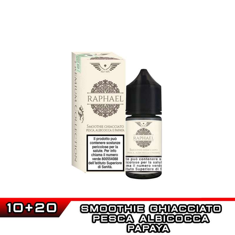 RAPHAEL è un aroma formato Mini Shot 10+20 ml della linea Premium realizzata da Holy Vape. Un liquido Fruttato e Fresco al sapore di Smoothie ghiacciato con Pesca, Papaya e Albicocca.